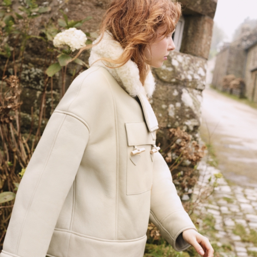 Inspiré des cabans marins, ce manteau se distingue par son shearling double face.