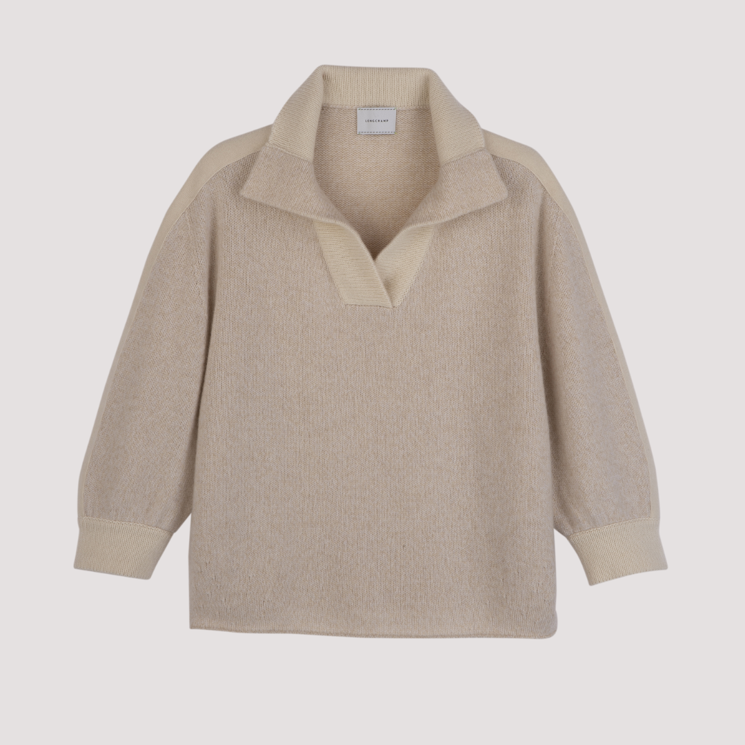 Ce pull ample en 100 % cachemire se distingue par sa bande sur l'épaule, mettant en valeur la silhouette. Sa coupe légèrement oversize, son col polo ouvert, ses manches 3/4 et son fil chiné en font une pièce sophistiquée, parfaite en toute circonstance.